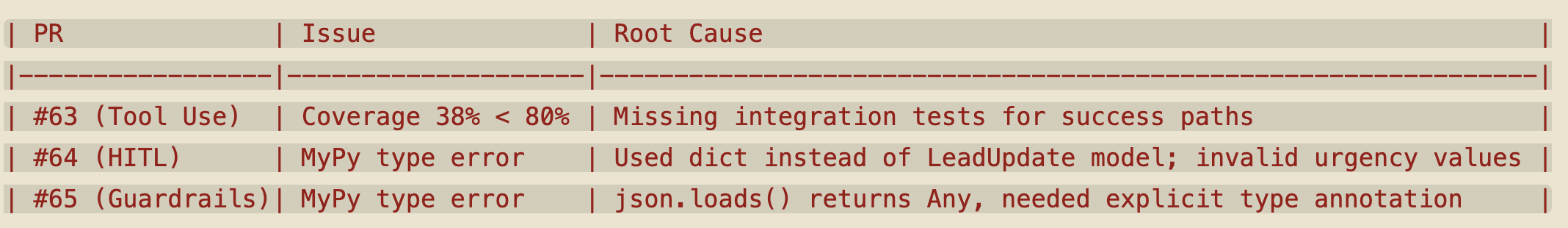 Make quality gates explicit and automated. The worker agent was running tests, but it didn't know to check coverage thresholds. Type checking wasn't in the protocol at all. You can't assume agents will infer quality standards from context.