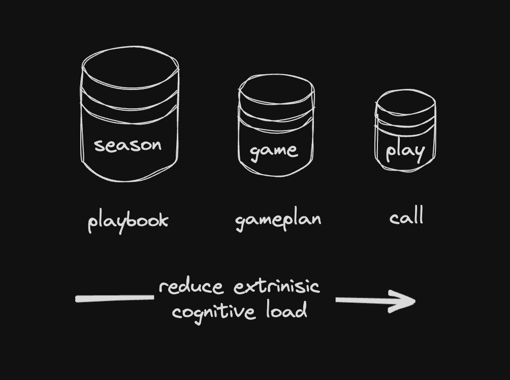 Stripped to its essence, the coach’s job is to reduce cognitive load, and ensure that the right people are having the right conversation at the right time. During preseason, it’s appropriate for the coaching staff to noodle over the playbook. During game week the offensive and defensive coordinators should be going over the game plan with the team. Once the whistle blows, the time for noodling is over. The team must focus on the call, which expresses the irreducible, and intrinsic cognitive load of each play.